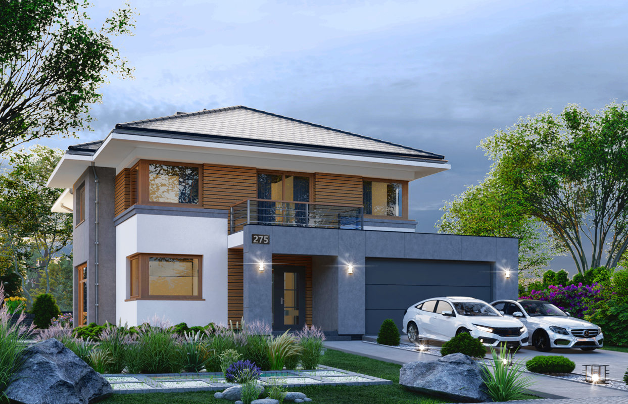 Dom piętrowy o nowoczesnej i efektownej sylwetce oraz obszernych wnętrzach, zaprojektowany dla 4-6 osobowej rodziny. Wielkości pomieszczeń w tym domu zadowolą najbardziej wymagających, a narożne okna nadają bryle domu lekkości. Prosta frontowa ściana wysunięta z elewacji tworzy efektowny ekran z podcieniem wejściowym, który prowadzi do wnętrza domu. Przedsionek z miejscem na szafę ubraniową prowadzi do przestronnej części dziennej. Foremna kuchnia (z wydzieloną spiżarnią) łączy się przestrzennie z jadalnią i salonem. W salonie nie zabrakło miejsca na efektowny dwustronny kominek oraz wyjście na osłonięty balkonem taras. Jadalnia ma także wyjście na taras „śniadaniowy”. Na piętrze mieszczą się: cztery wygodne sypialnie, garderoby i duża łazienka.