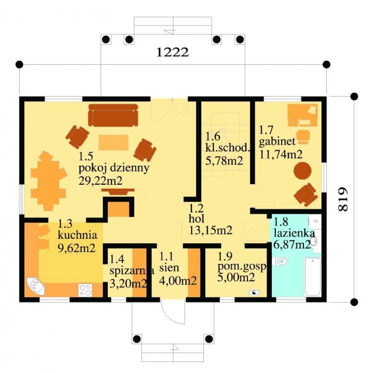Główną zaletą projektu Amelia jest podział na strefy dzienną i nocną względem kondygnacji. W projekcie maksymalnie zagospodarowano każdy metr kwadratowy powierzchni, a dobrze pomyślany układ pomieszczeń ułatwi poruszanie się po domu oraz pozwoli na gustowną aranżację wnętrz. Do domu wchodzi się przez sień, w której wydzielono miejsce na szafę wnękową. Po prawej stronie zaprojektowano pomieszczenie gospodarcze przeznaczone na kotłownię, a obok niego łazienkę dla gości. Dodatkowy zaciszny pokój sprawdzi się jako gabinet do pracy w domu lub biblioteka domowa. Reprezentacyjny pokój dzienny zlokalizowano w lewej części projektu. Przestronny salon łączy się tu z jadalnią oraz częściowo otwartą kuchnią, która sąsiaduje ze spiżarnią. Na poddaszu domu Amelia umieszczono zaś trzy wygodne, ustawne sypialnie, w tym jedną z garderobą, oraz łazienkę. Górna kondygnacja zapewni intymność mieszkańcom oraz wygodny wypoczynek z dala od hałasów.