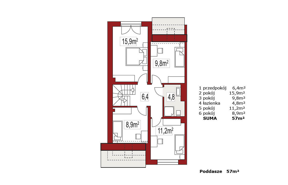- Dach: dwuspadowy, nachylenie 35°, więźba drewniana, dachówka ceramiczna.