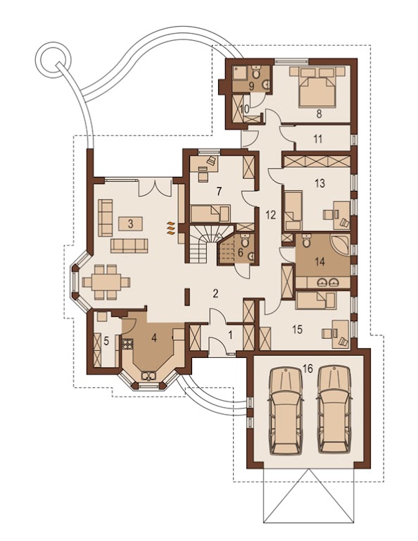 Dom parterowy z użytkowym poddaszem, z garażem dwustanowiskowym. Przeznaczony dla 5 osobowej rodziny.Wnętrze wyrażnie podzielone na dwie strefy:ogólnodostępną (saloną z jadalnią i przyległą kuchnią) oraz prywatną(sypialnie z wspólą łazienką i sypialnie rodziców z własną łazienką) Bezpośrednio z salonu można wyjść na zadaszony taras ogrodowy.Na tarasie zlokalizowano kominek grillowy.Lokalizacja kuchni od strony frontowej umożlia kontrolę nad frontową strefę budynku. Projekt posiada rozbudowaną funkcje mieszkalną na parterze,którą można dodatkowo powiekszyć o przestrzeń poddasza (poddasza do dowolnej aranżacji).