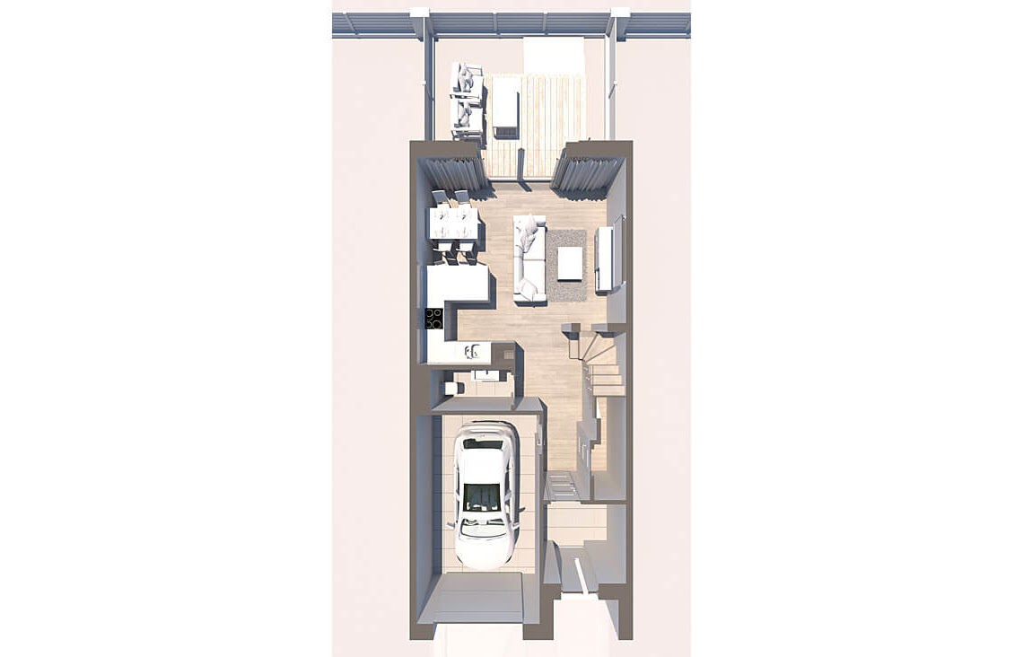 Diana B zestaw 6 segmentów z garażem jest doskonałym rozwiązaniem dla osób posiadających wąską działkę, ponieważ nie zajmuje wiele miejsca. Projekt jest idealną propozycją dla osób zainteresowanych domem z dachem dwuspadowym, co pozwala na znaczne oszczędności. Projekt Diana A segment prawy to dom piętrowy, co sprawia, że strefa dzienna i nocna są od siebie wyraźnie oddzielone. Dodatkowo jest możliwość zaadaptowania poddasza, a dodatkowy metraż możemy wykorzystać zgodnie z własnymi potrzebami. Autor projektu przewidział w nim ciekawie prezentującą się strefę dzienną. Tworzy ją między innymi funkcjonalna kuchnia, którą każdy Inwestor swobodnie dostosuje do swoich potrzeb. W salonie znajduje się nastrojowy kominek dający przyjemne ciepło i nadający wnętrzu przyjemnej atmosfery. Projekt przewiduje jedną toaletę na parterze oraz jedną komfortową łazienkę na piętrze. Strefa sypialniana składa się z trzech pokoi, co jest doskonałą opcją dla niedużej rodziny. Przestrzeń można wykorzystać także jako pokój dla gości lub gabinet. W domu nie zabrakło również miejsca na praktyczne zaplecze gospodarcze. Efektowny taras pozwala na kontakt z naturą bez zbytniego oddalania się od domowego zacisza. Jego wygląd nawiązuje do stylu tradycyjnego, dlatego będzie prezentować się doskonale niezależnie od okolicy.