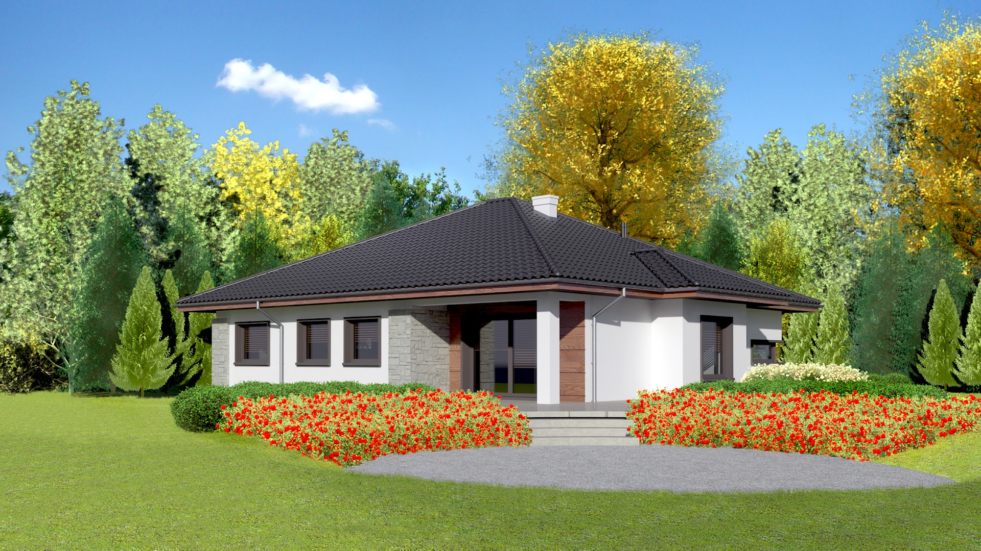 Elegancki i funkcjonalny parterowy dom, którego wnętrza zaprojektowano z myślą o codziennym komforcie czteroosobowej rodziny – tak w największym skrócie można opisać Dom przy Pastelowej. Ten projekt stanowi przykład na doskonałe połączenie tradycyjnej formy z nowoczesnym sposobem wykończenia oraz bardzo precyzyjnie zaplanowanym, bogatym programem funkcjonalnym. Zgrabną, zwartą bryłę budynku, urozmaiconą wnęką wejściową, wykuszem oraz podcieniem tarasowym, zwieńczono tutaj eleganckim dachem czterospadowym. Dom przy Pastelowej, między innymi dzięki harmonijnie skomponowanym materiałom zastosowanym do wykończenia elewacji, stanowi uniwersalną propozycję, która bez trudu wkomponuje się w każdy rodzaj otoczenia.