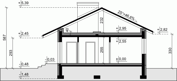 - Ściany nośne: pustak ceramiczny 25 cm.
