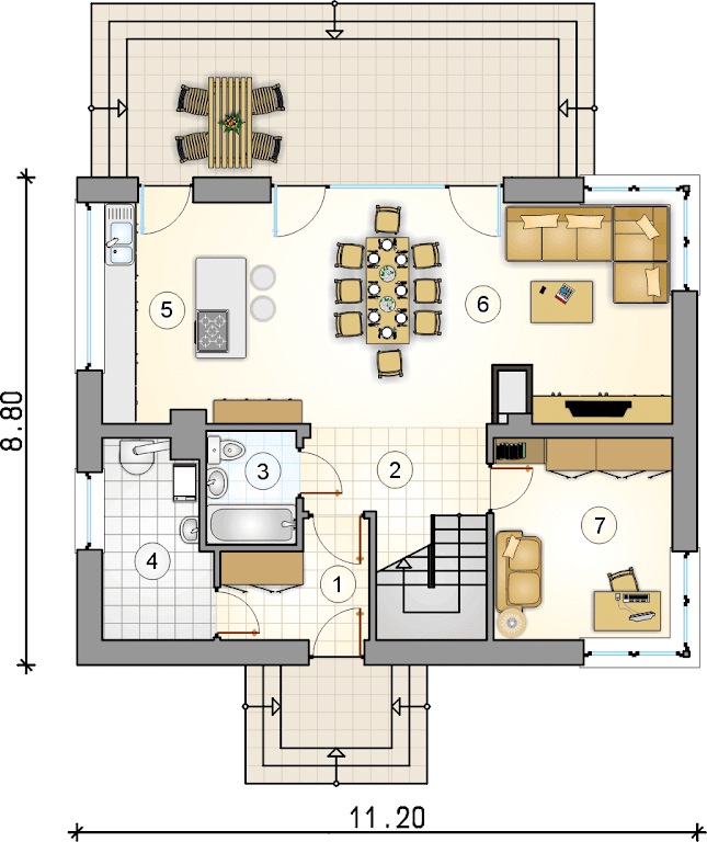 Parterowy dom z poddaszem użytkowym, z wykuszami nad wejściem i tarasem