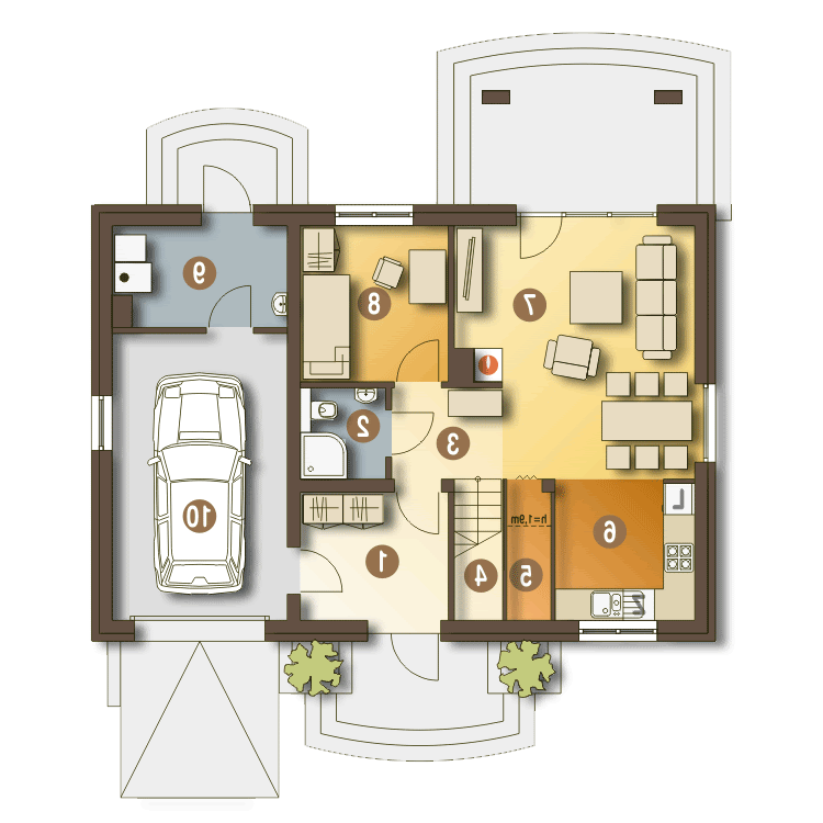 Julia III to wyjątkowo funkcjonalny i ekonomiczny dom dla 4-5-osobowej rodziny. Projekt domu jednorodzinnego Julia III jest atrakcyjną propozycją domu o tradycyjnym wyglądzie. Julia III to pomniejszona wersja projektu domu Julia II. Dom ten posiada dach dwuspadowy oparty na ściance kolankowej wysokości około 80cm. Na parterze mamy przewidzianą część ogólnodostępną obejmującą wiatrołap, hol, pokój lub gabinet, łazienkę, salon z jadalnią oraz kuchnię i niewielką spiżarnię pod schodami. W salonie mamy zaprojektowane duże drzwi tarasowe dające dużą ilość światła, zapewniające dostęp do tarasu ogrodowego. Wyjście na taras zadaszone jest dachem, aby przy niewielkich kosztach zapewnić ochronę w deszczowe dni. W salonie przy aneksie jadalnym zaprojektowane jest duże okno zapewniające kontakt z otoczeniem w czasie spożywania posiłków. Na parterze mamy także część gospodarczą, obejmującą dostępny z wiatrołapu garaż oraz kotłownię na paliwo stałe. Do kotłowni mamy dostęp z zewnątrz, od strony ogrodu. Poddasze to część prywatna. Prowadzą tam wygodne drewniane schody, którymi dostaniemy się do przedpokoju, z którego następnie mamy dostęp do trzech niedużych sypialni oraz jednej większej zlokalizowanej nad częścią gospodarczą. z dostępem do własnej łazienki. Jest tu też jeszcze jedna łazienka dostępna bezpośrednio z przedpokoju. Projekt domu Julia II to ciekawa propozycja dla rodzin poszukujących komfortowego domu jednorodzinnego o tradycyjnej stylistyce i o energooszczędnych parametrach użytkowych.
