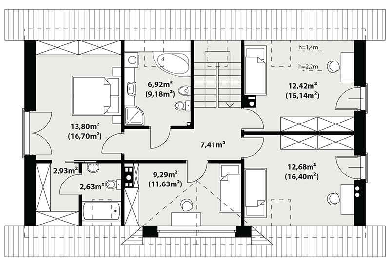 Na poddaszu domu Nemo 3 znajdziemy bardziej zaciszną, prywatną część wnętrz. Powierzchnię drugiej kondygnacji podzielono na cztery wygodne sypialnie. Najlepiej wyposażony został apartament gospodarzy, gdyż dwuosobowa sypialnia łączy się z prywatną garderobą oraz łazienką. Pomiędzy pokojami znalazło się także miejsce na drugą, ogólnodostępną łazienkę, w której zmieści się zarówno wanna, jak i kabina prysznicowa.