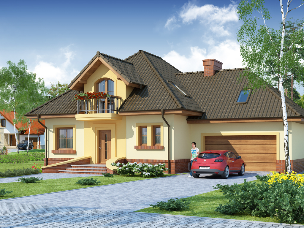 Dom z poddaszem użytkowym, przeznaczony dla 4-5-osobowej rodziny. Na parterze znajduje się przestronny pokój dzienny połączony z jadalnią i otwartą kuchnią. Rozwiązanie funkcjonalne pozwala na oddzielenie ww. pomieszczeń. Na parterze przewidziano dodatkowy pokój, łazienkę oraz spiżarnię dostępne z holu. Poprzez pomieszczenie gospodarcze można dostać się do garażu. Na poddaszu znajdują się trzy sypialnie, garderoba dostępna z pokoju, łazienka oraz strych.