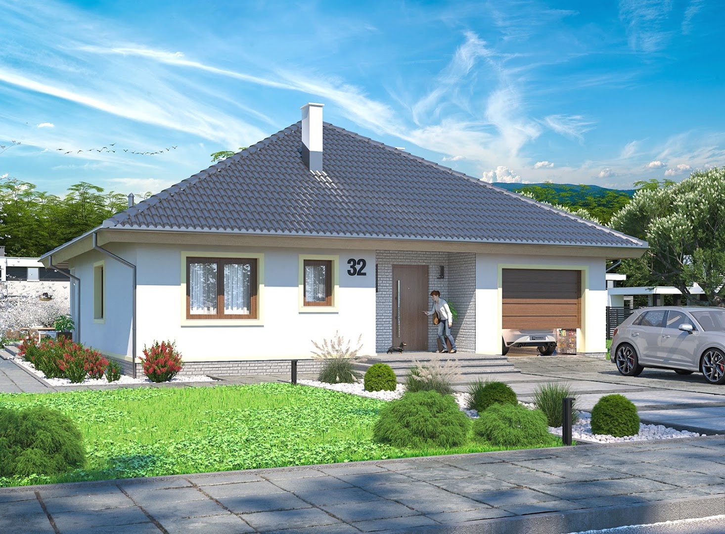 Jeśli planują Państwo budowę wygodnego domu parterowego z trzema sypialniami oraz jednostanowiskowym garażem wkomponowanym w bryłę, to projekt Serafin 2 (paliwo stałe) stanowi interesującą i atrakcyjną propozycję. Jego powierzchnia użytkowa wynosi 114,12 m². Wygodnie zamieszka w nim nawet czteroosobowa rodzina. Projekt na pewno przypadnie do gustu kolejnym pokoleniom, dzięki temu, że jest propozycją o ponadczasowej i modnej elewacji.