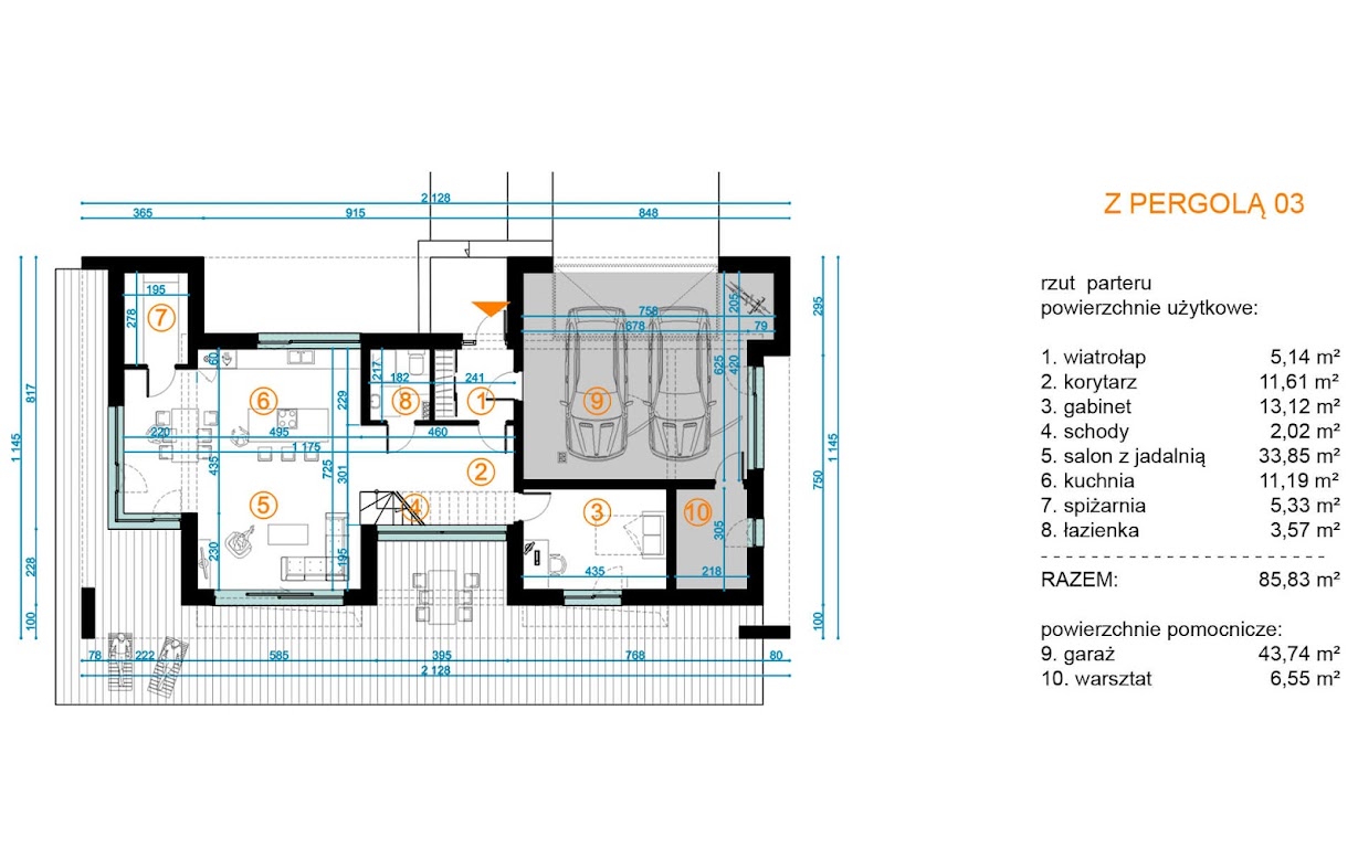 Z pergolą 03 jest to projekt domu z poddaszem użytkowym zorganizowanym w oparciu o rzut prostokąta. Parter domu stanowi dość rozrzeźbiona bryła zawierająca liczne wnęki i uskoki, podczas gdy poddasze zamyka się w regularnym układzie ścian, a wszystkie sypialnie mają dostęp do rozległego tarasu zadaszającego pomieszczenia oraz taras parteru. W ten sposób uzyskaliśmy ciekawy efekt wizualny. Na jego elewacje składają się trzy warstwy zróżnicowane kolorystycznie i materiałowo. Najbardziej zewnętrzną stanowi obramowanie budynku wykonane w białym tynku, będące też zadaszeniem tarasu oraz balustradą tarasu na poddaszu. Kolejno dostrzegamy ściany parteru wykonane z okładziny klinkierowej oraz ściany poddasza w szarym tynku. Dodatkowym atutem domu są stalowo-drewniane schody widoczne od strony ogrodu przez duże przeszklenie w ścianie zewnętrznej.
