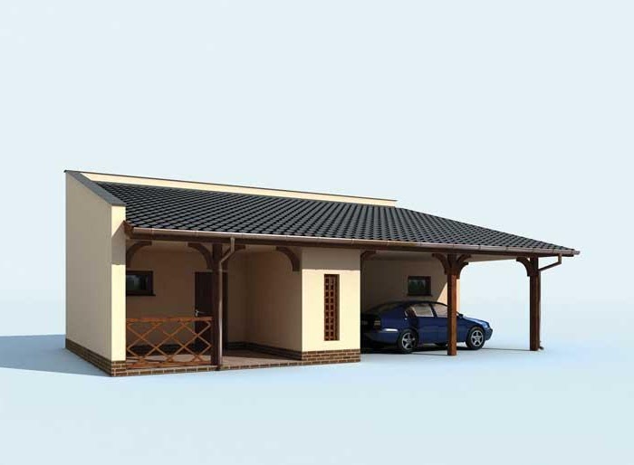 Garaż jednostanowiskowego z wiatą garażową i pomieszczeniem gospodarczym.