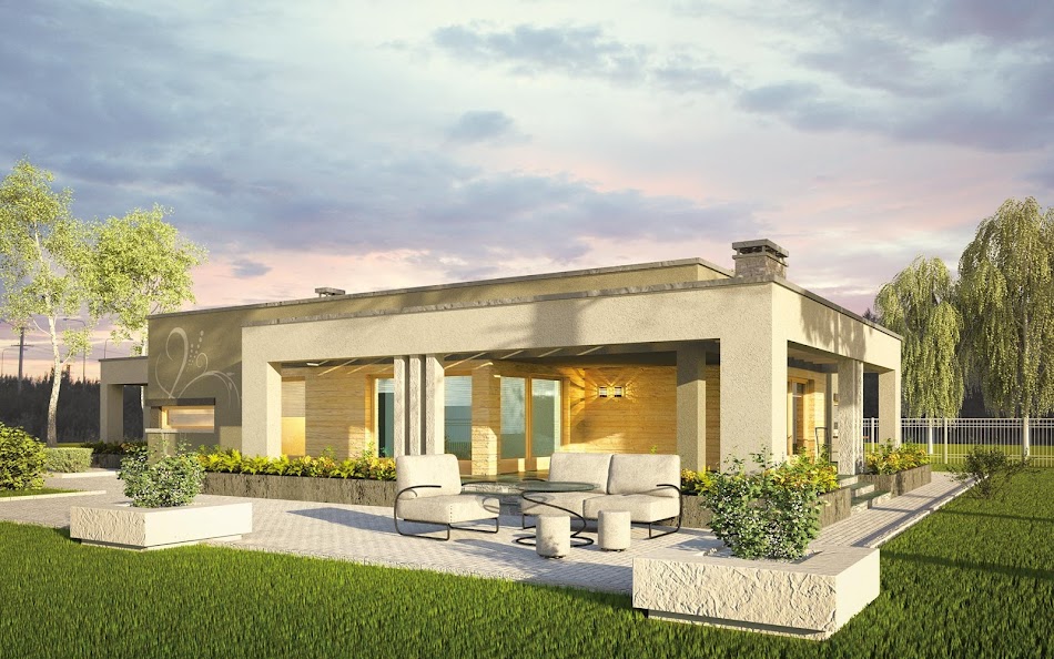 Nowoczesny parterowy dom z płaskim dachem, oryginalną pergolą, tarasem wypoczynkowym i 2-stanowiskowym garażem