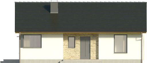 Karmelek to uroczy, nieduży parterowy domek utrzymany w nowoczesnej stylistyce. Pośrodku elewacji frontowej znalazła się niewielka wnęka wyróżniona okładziną kamienną. W obrębie elewacji tylnej uwagę przykuwa taras w rogu budynku z ciekawym, narożnym oknem. Prosty dwuspadowy dach to najbardziej ekonomiczne rozwiązanie. Wykończone głównie białym tynkiem i płytkami ściany również nie przysporzą nadmiernych kosztów.